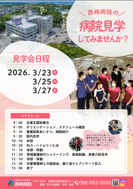 当院では、オリエンテーションや院内見学、看護技術体験、シャドーイング、先輩看護師との座談会などを含むプログラムで病院見学を実施しています